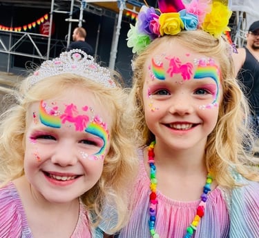 Hun tror fuldt og fast på, at ansigtsmaling og glitter ikke kun er for børn! Hun bruger ansigts og kropsmaling til arrangementer og festivaler for voksne. Anouska tilbyder også en glitterbar og airbrush-tatoveringer (der ser realistiske ud). Regnbue Ansigtsmaling tilbyder også trylle- og ballondyr. De samarbejder med 'Tryl og Ballondyr' for at tilbyde alt, hvad du behøver til en fantastisk fest.